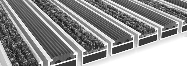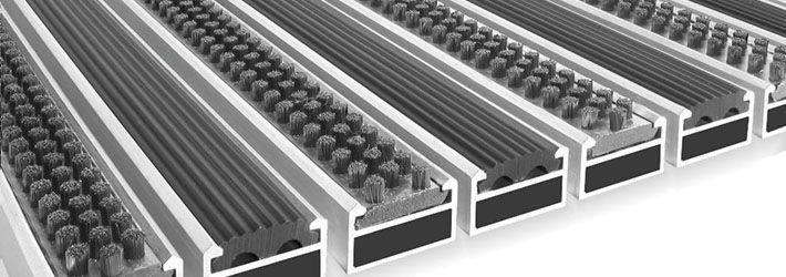 Грязезащитные решетки Profesional Стандарт представляют собой конструкции из усиленных литых алюминиевых профилей с различными вставками: резина, щетка, текстиль.